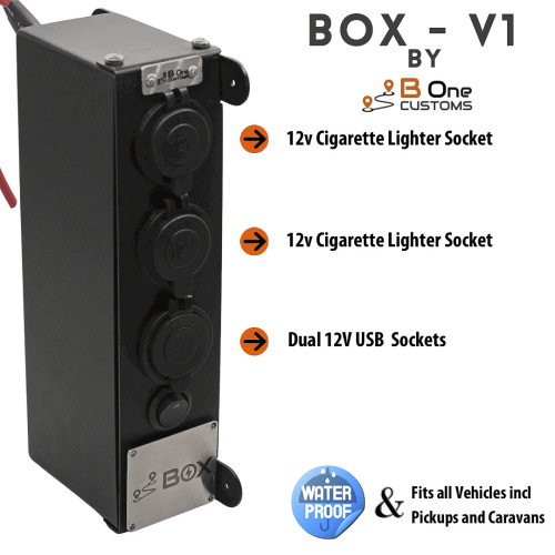 - Pre wired sockets and switch with Marine Grade Cables (additional wiring is needed either from the Main Battery or from the Auxiliary Battery according to the vehicle and the placement of our ‘BOX’