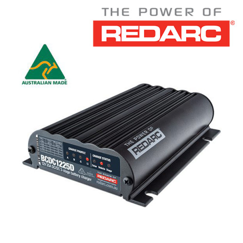 The REDARC BCDC1225D is a 12V 25A In-vehicle DC to DC battery charger suitable for battery types including lithium, AGM, GEL, standard lead acid and calcium.